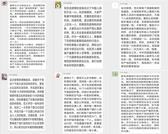 在主题教育结束后,参会的各位同志结合自己的亲身经历与所见所想,线上踊跃发声。大家在本次疫情中都感受到了中国力量与中国速,并为日益强大的祖国而感到骄傲,同时也对本次疫情中无私奉献的医务人员、科研工作者们表达了崇高的敬意。