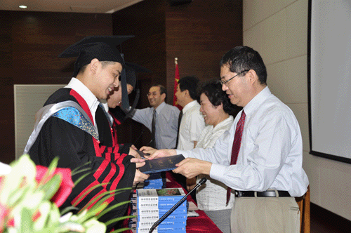 毕业典礼在雄壮的中华人民共和国国歌声中拉开帷幕。首先,唐勇副所长宣读了有机所今年夏季毕业的61名博士生和23名硕士生名单。接着,伴随着轻快的进行曲,毕业生们满怀激动与喜悦的心情,分别从丁奎岭所长、郏静芳书记、马大为副所长和唐勇副所长手中接受颁发的毕业证书。毕业典礼上,郏静芳书记还宣读了2012年度荣获中科院优秀毕业生、上海市优秀毕业生及中科院三好学生名单,并对获奖的同学进行了表彰。