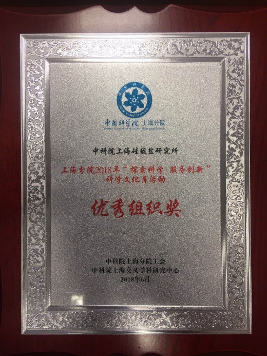 在6月23日举行的中国科学院上海分院2018年科学文化月活动闭幕式上,中国科学院上海硅酸盐研究所荣获上海分院2018年“探索科学?服务创新”科学文化月活动优秀组织奖和优秀科普活动组织奖。上海硅酸盐所工会主席孙伟嬿参会并领奖。